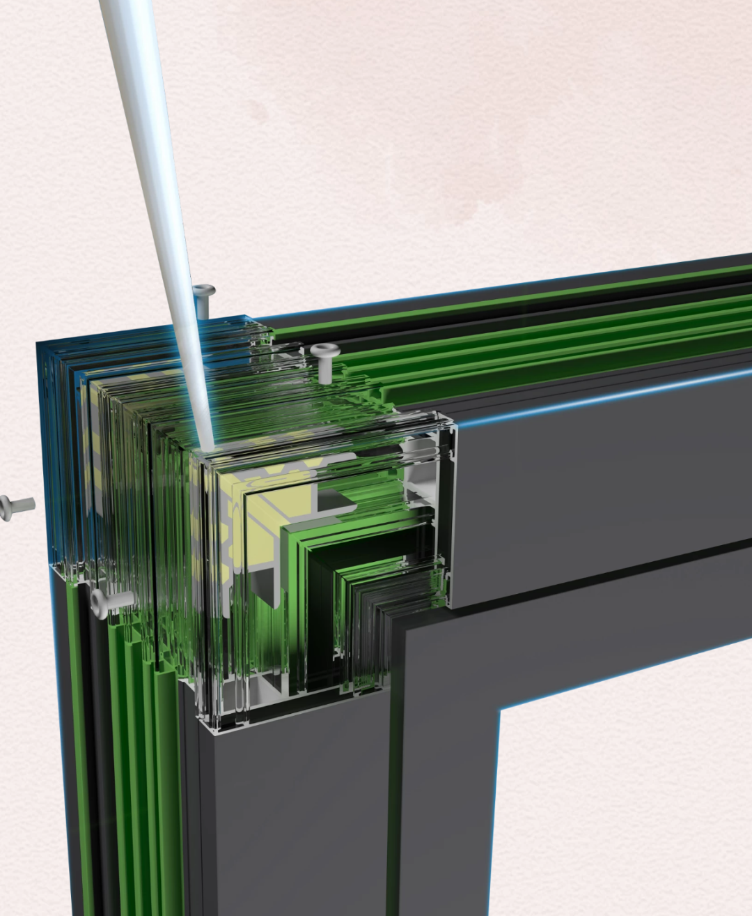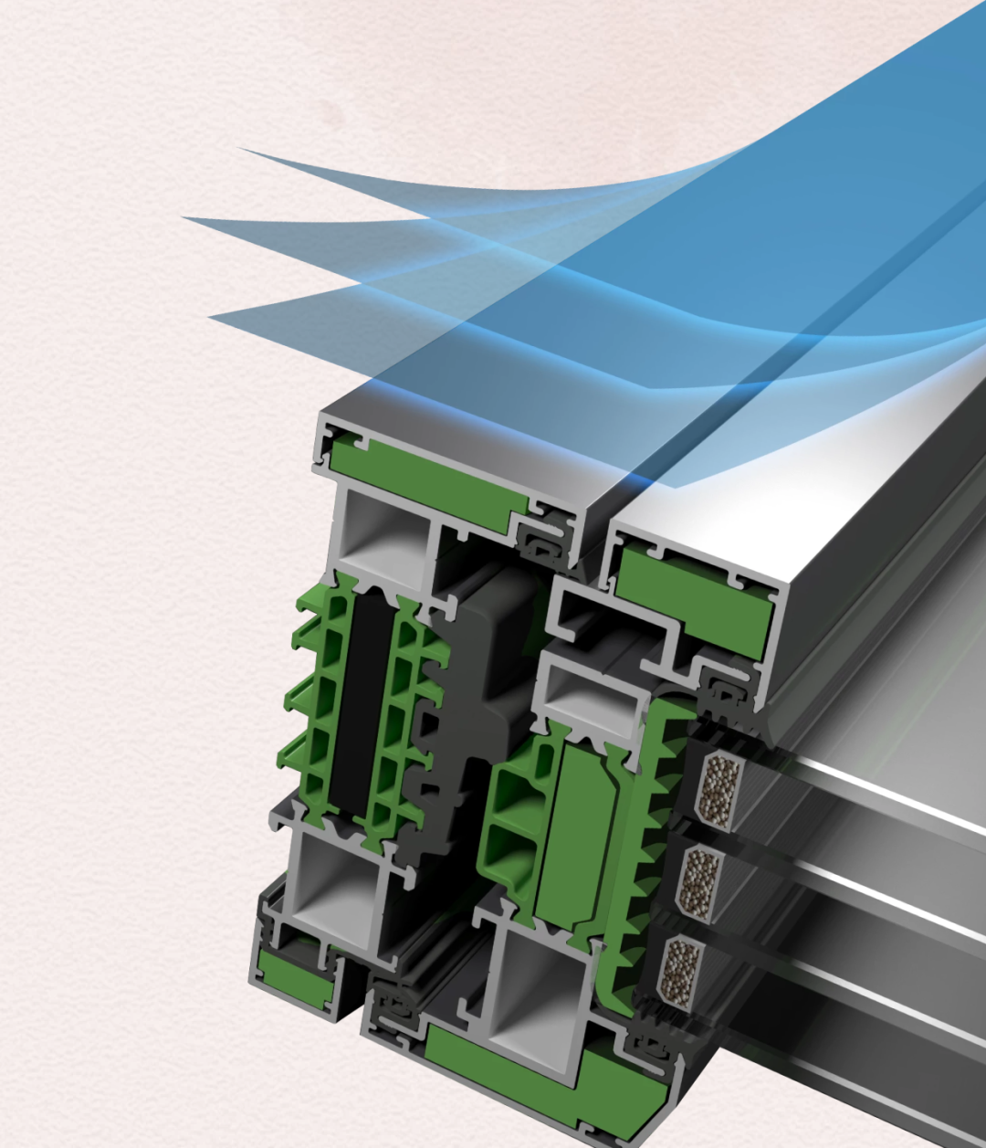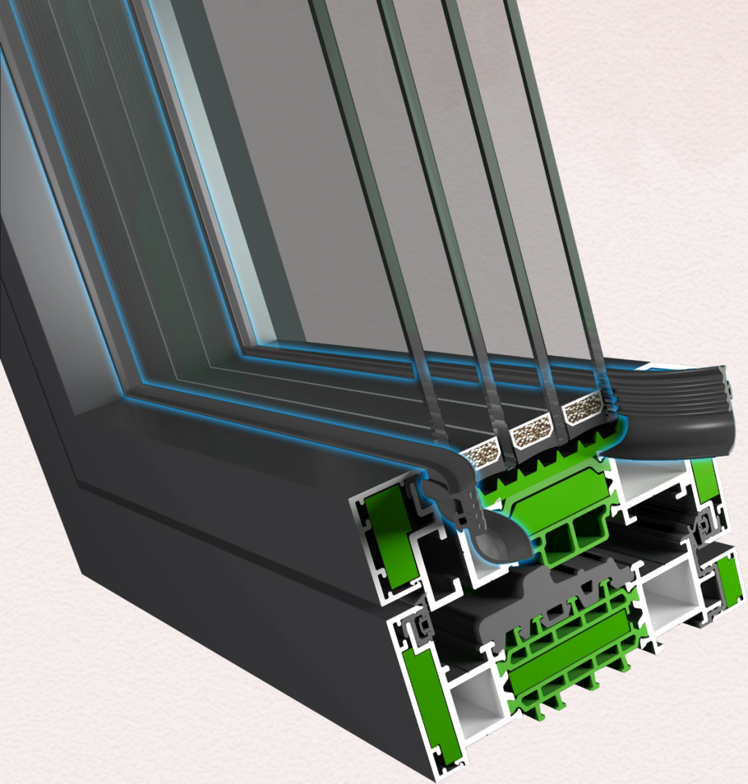 欧大师隔热门窗腔体采用多腔体PA66隔热条,这是遵循巧妙的几何定律来设计,设计师采用五腔三角体构造,这种设计原理会让门窗具有五重隔热防护,从而更好的阻隔了热对流,让隔热效果更持久稳定。同时,区别于一般门窗内隔热条为黑色,欧大师隔热门窗特别将其定为军工绿色,以便于用户在使用过程中达到更好的效果。