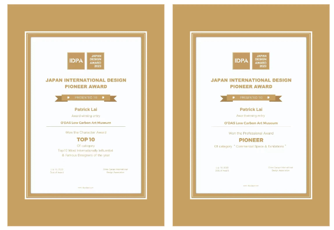 2023年7月18日,2023日本 IDPA AWARD 国际先锋设计大奖颁奖典礼于日本东京举行。欧大师低碳艺术馆 · 佛山居然店经过层层筛选,在全球众多顶尖作品中脱颖而出,斩获“日本 IDPA AWARD 国际先锋设计大奖”,同时,设计师赖柏全老师荣膺“日本 IDPA AWARD - 2023年TOP10国际影响力创新设计师”奖项!